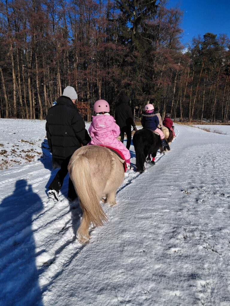 gemeinsam mit einem Elternteil bereitet das Kind unter Anleitung sein Pony selbst vor mit putzen und satteln und anschließendem reiten in unser schönes Gelände mit Teichen und Wald.